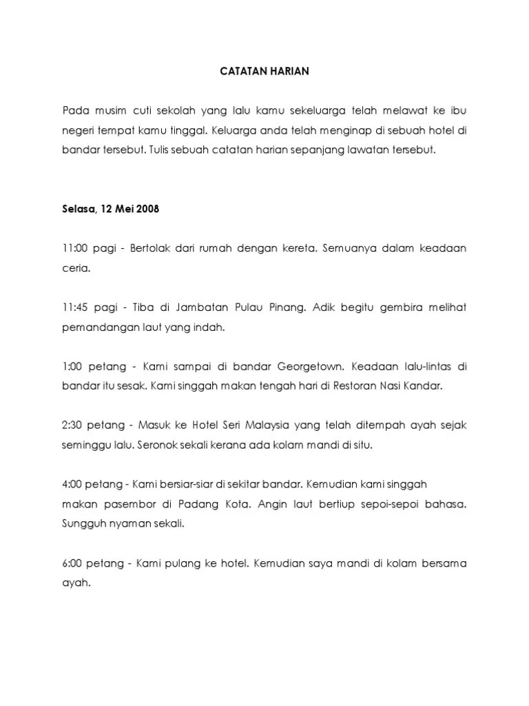 Baca versi flipbook dari unit 26 hari minggu saya catatan . Menulis sebuah karangan jenis catatan berdasarkan bahan yang diberi. Tulis sebuah catatan harian kamu tentang aktiviti kamu dalam sehari semasa cuti sekolah persekolahan. Kamu telah melakukan beberapa aktiviti sempena cuti persekolahan yang lalu. Tulis catatan harian tentang aktiviti kamu itu.latihan kerja rumahsemalam hari . Catatan harian pada musim cuti sekolah yang lalu kamu sekeluarga telah . Catatan harian kamu telah menyertai satu lawatan sambil belajar ke sebuah negeri. Saya mengulangkaji pelajaran serta menyiapkan kerja sekolah. Karangan isi masa cuti doc www bmspm net contoh karangan spm aktiviti berfaedah ketika cuti sekolah. Setiap orang melakukan pelbagai aktiviti pada cuti hujung minggu. Baca versi flipbook dari unit 26 hari minggu saya catatan diari. Contoh karangan langkah langkah memanfaatkan dan menghabiskan cuti.